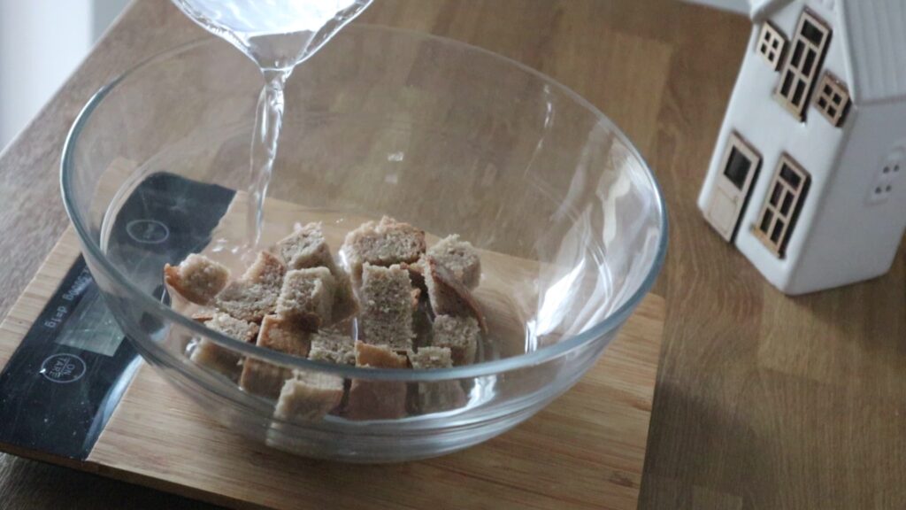 1. 古いパンを細かく切って、ボウルに入れておく