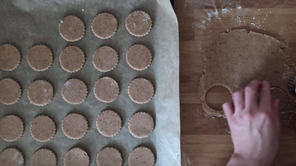 3. 直径5㎝のギザギザの丸形で抜いていき、クッキングシートを敷いた天板に置いていく