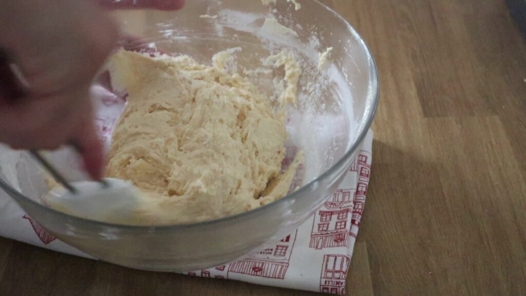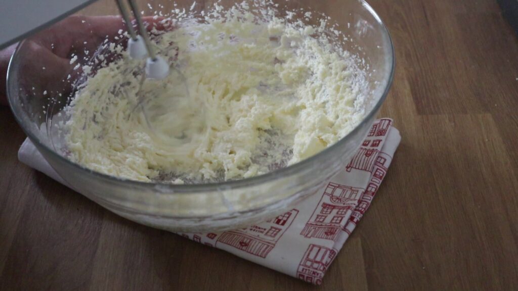 - 白くもったりするまで、3分から5分ほどハンドミキサーで泡立てる