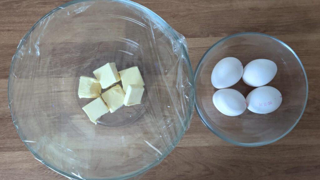 - 卵を4個、冷蔵庫から取り出し、同じように室温においておく